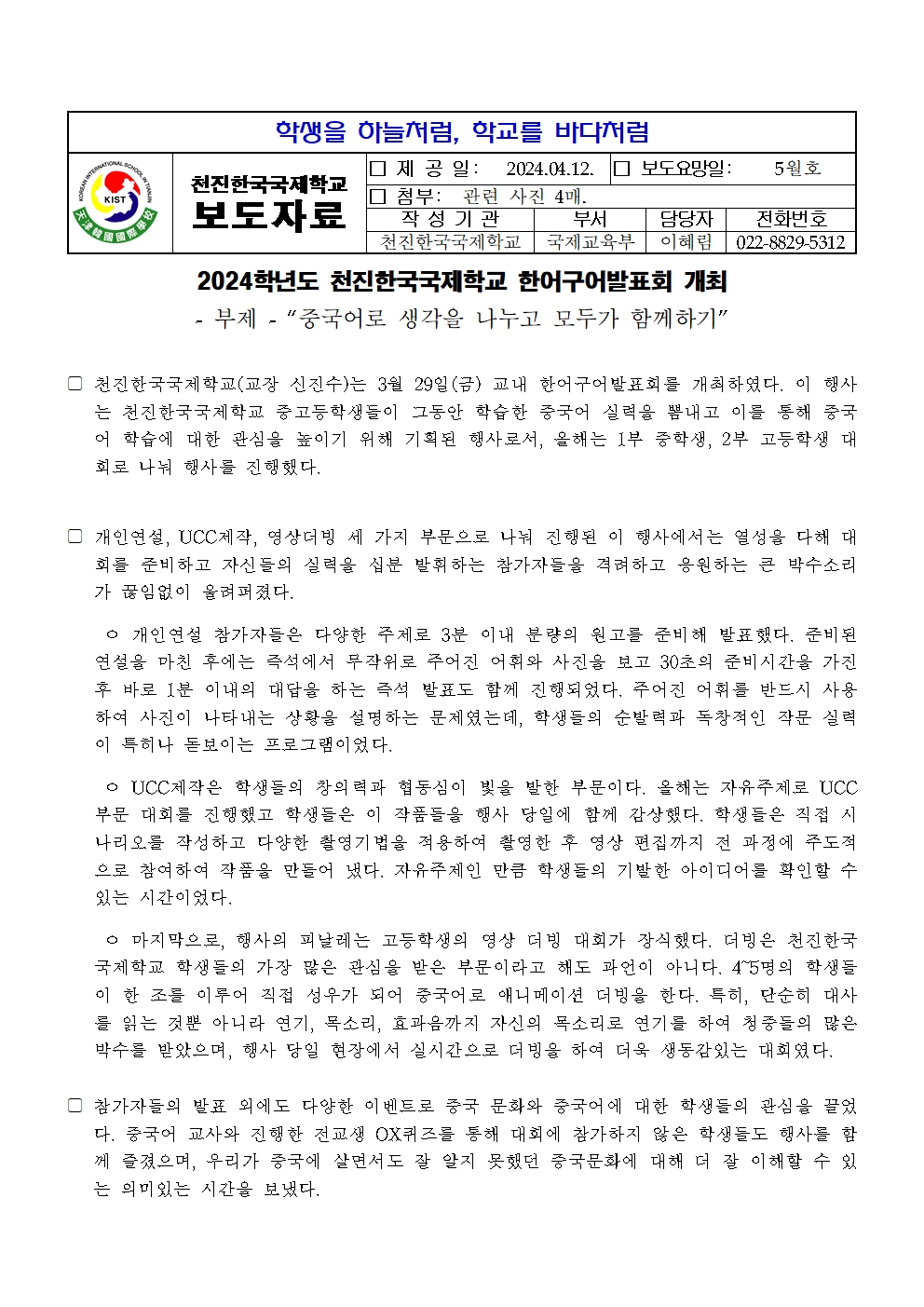 알림마당 NO.1 KOREAN INTERNATIONAL SCHOOL IN TIANJIN